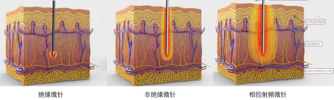 2、第二代黄金微针(非绝缘针):整个针体都有能量放射,作用范围广,刺入一下就能达到全层治疗。而且在针体周围会产生热凝固带,使毛细血管封闭,减少出血。真皮的含水量比较多,相对表皮的阻抗值较小。而射频微针会利用真皮和表皮之间的阻抗值差异,在电流方式过程中能量会自动流向阻抗值较小的地方,也就是能量会往真皮层集中,降低表皮色沉风险。
