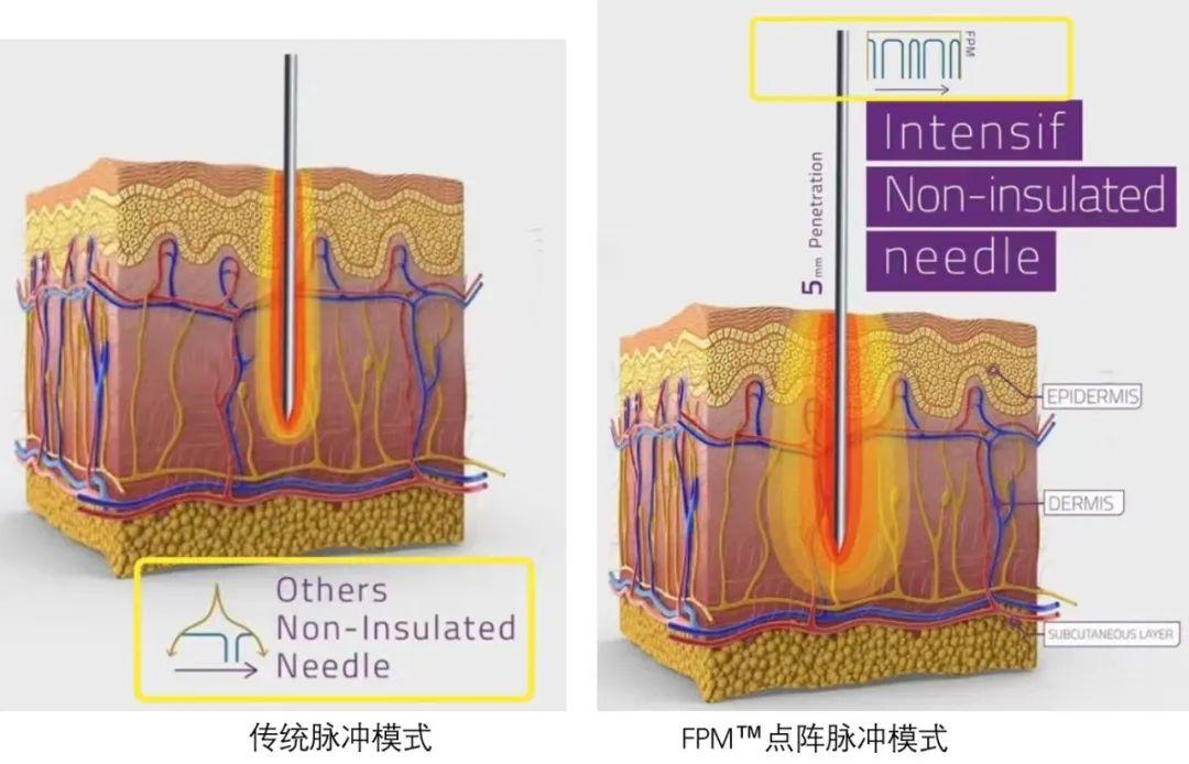 3、新一代相控微针:在第二代的基础上加入了FPM分段脉冲技术,在微针穿透皮肤之后,能量平帽式分段脉冲发射,核心区域可加热到62度。且可作用至5mm,所形成的微针穿刺和射频刺激的双效能量更加均匀、稳定、安全、有效。